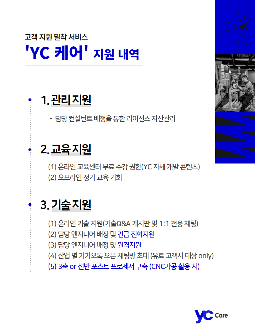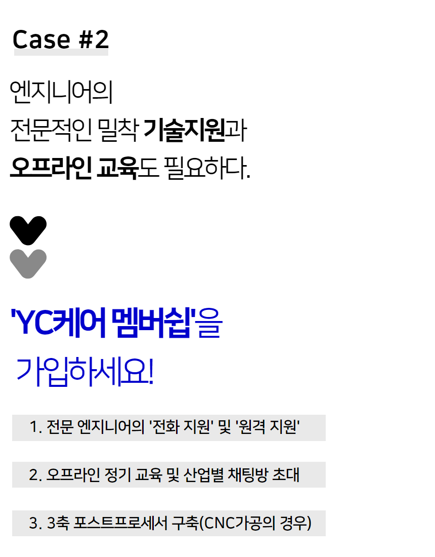 'YC클래스': YC코퍼레이션에 자체 운영하는 CAD/CAM 교육사이트로, 해당 사이트에 업로드되는 유료 교육도 YC에서 소프트웨어를 구매하면 무료 수강코드를 제공해드립니다.
